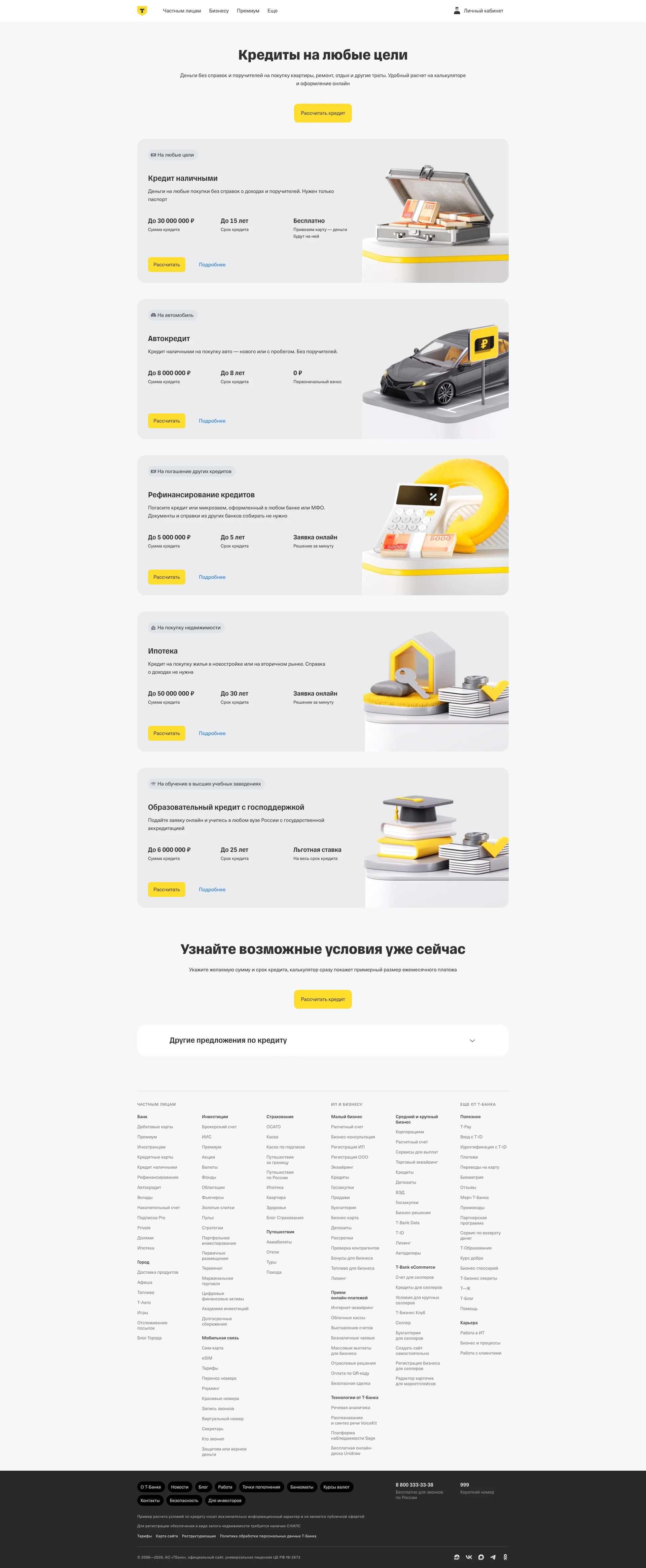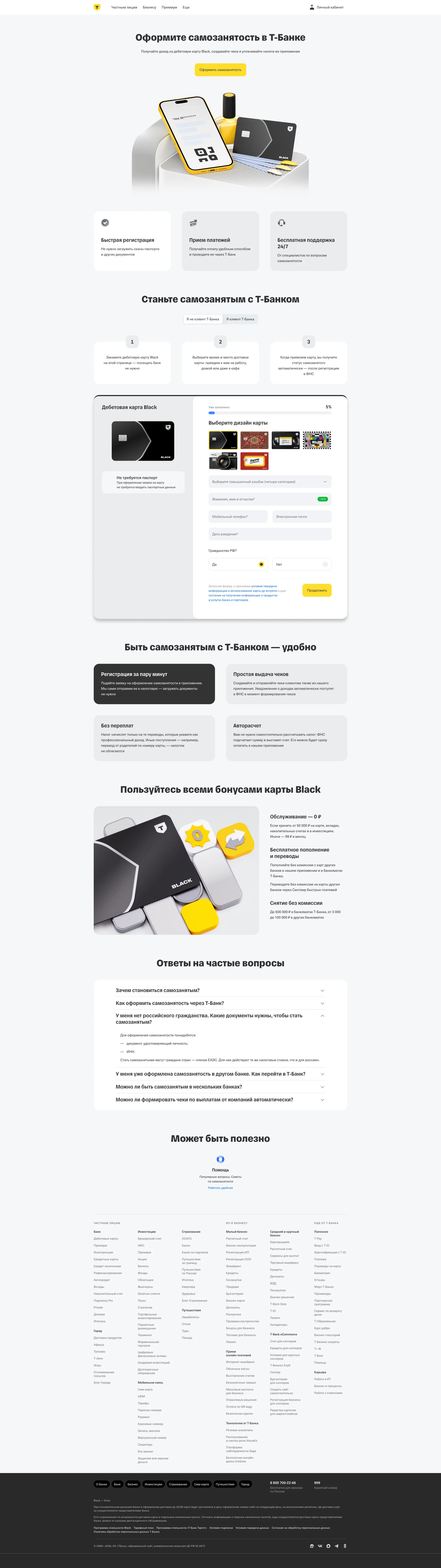 T-Bank — web app in the Fintech. Financial technology: banking, payments, investments. Online bank for individuals and businesses. Cards, loans, deposits, investments, mobile carrier. The interface includes 4 UI patterns: Product landing page, Content card grid layout, Navigation bar and menu, Step-by-step product introduction. The color palette is built on light tones.
