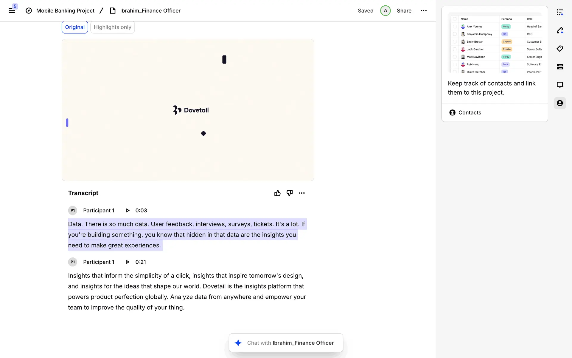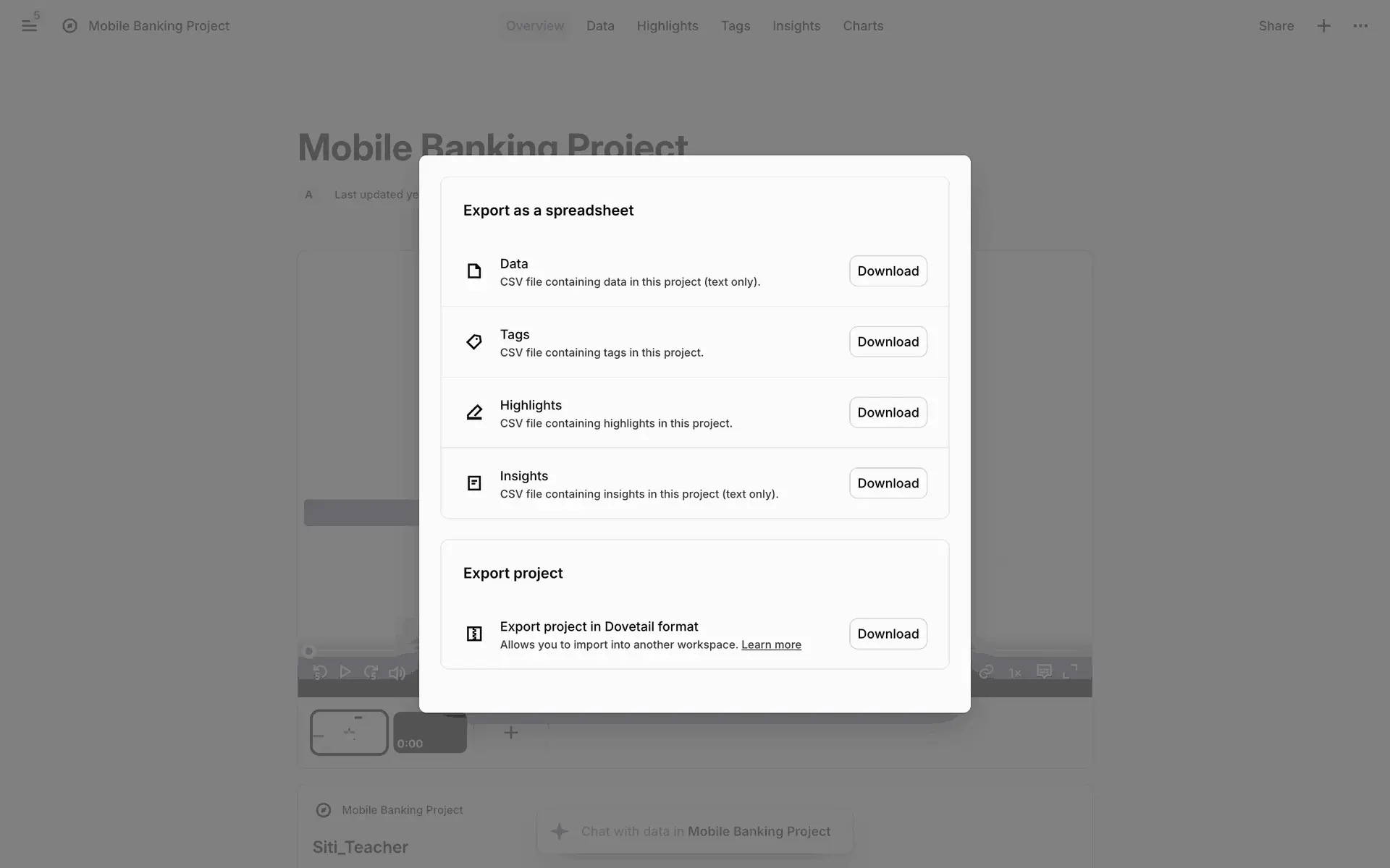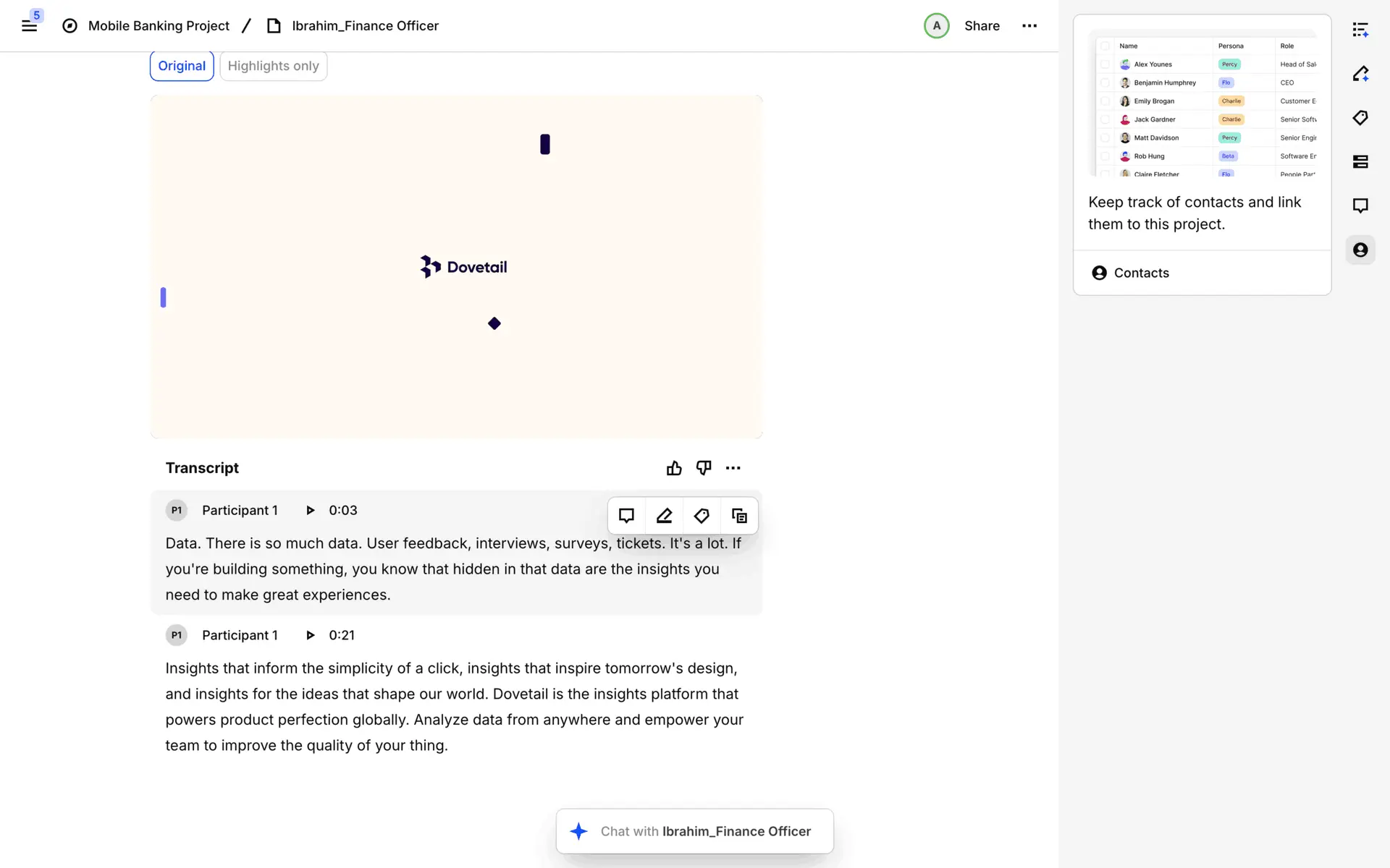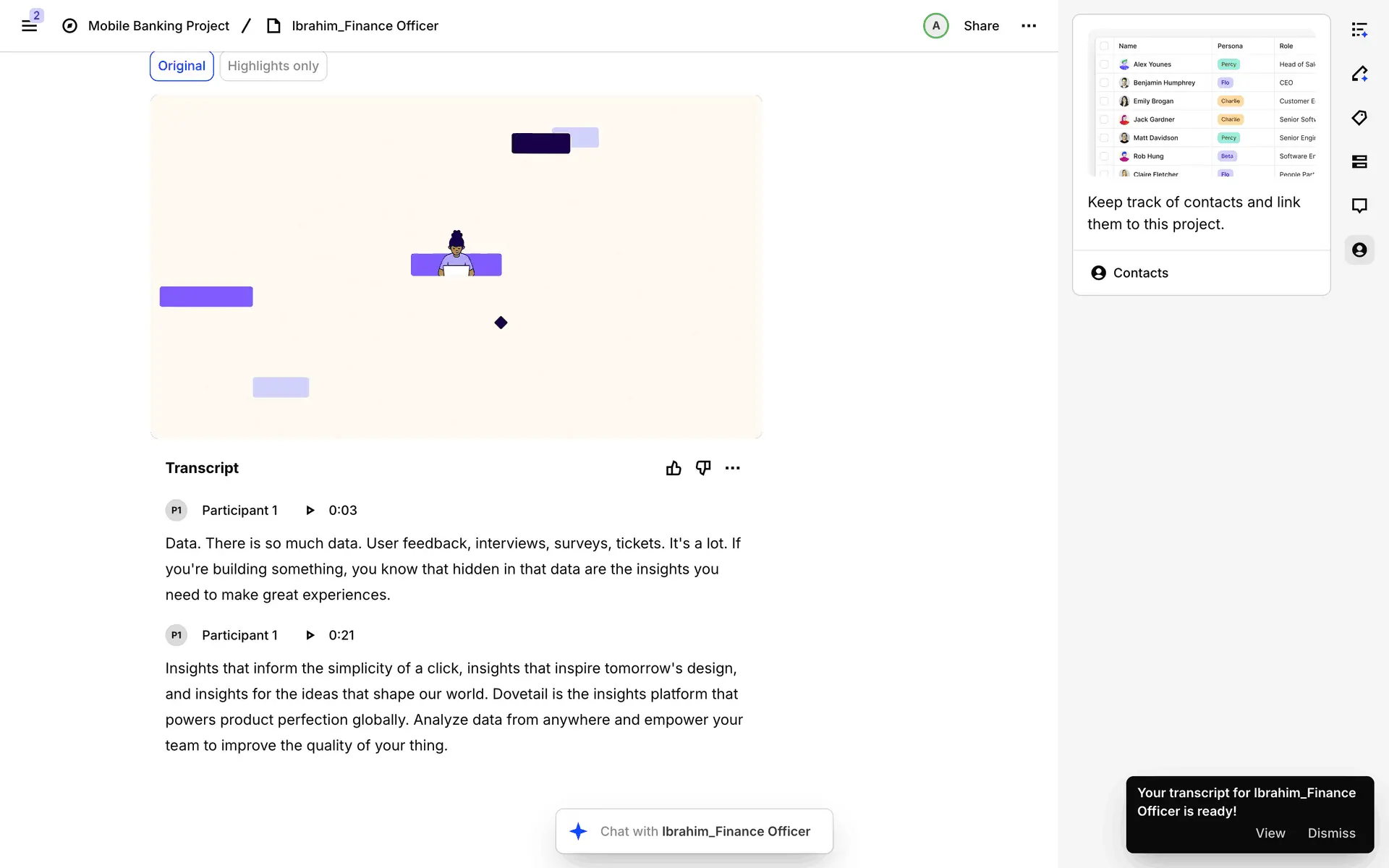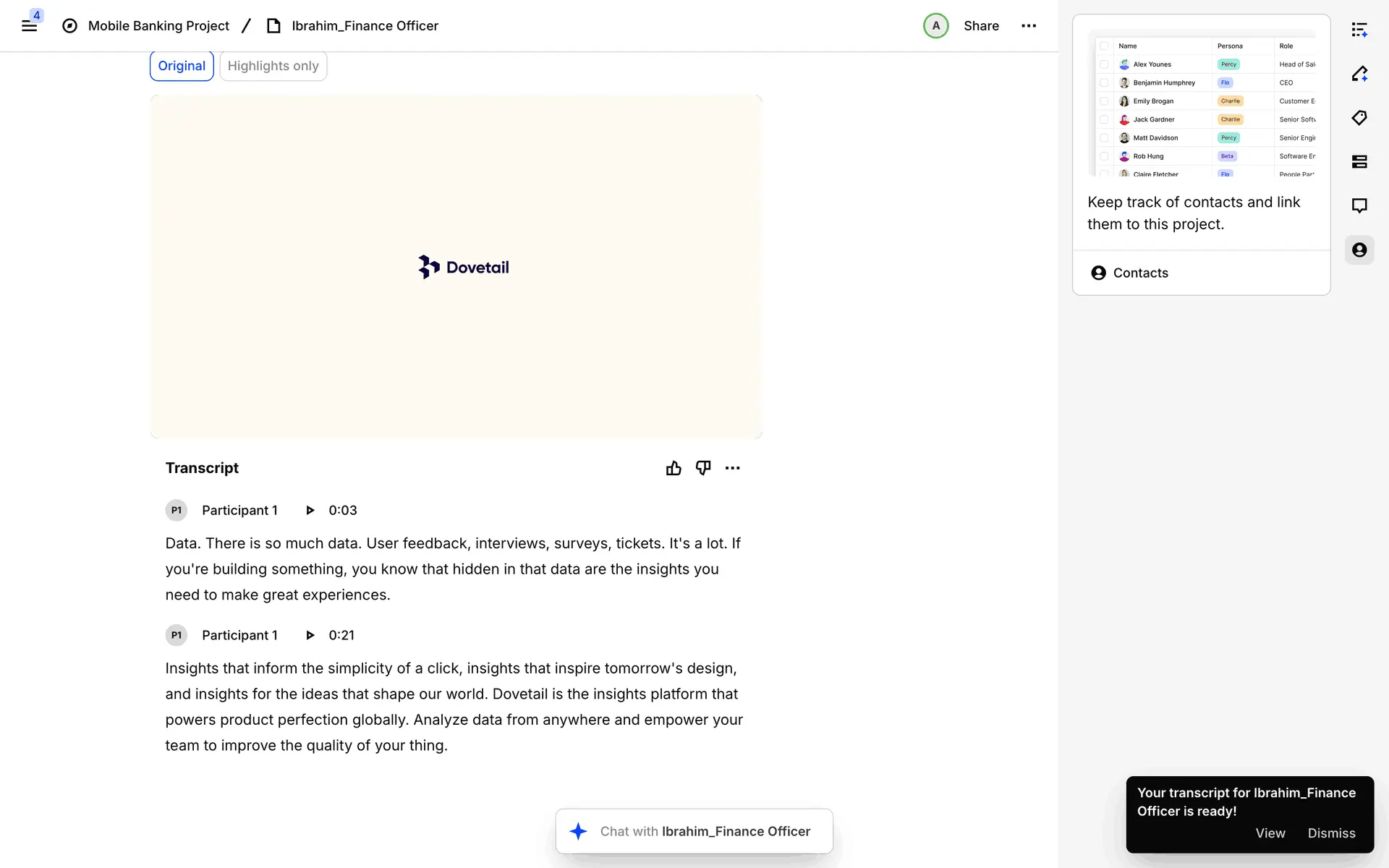 Dovetail — платформа для управления исследованиями пользователей и качественными данными. Помогает командам собирать, анализировать и делиться инсайтами из интервью, опросов и заметок.