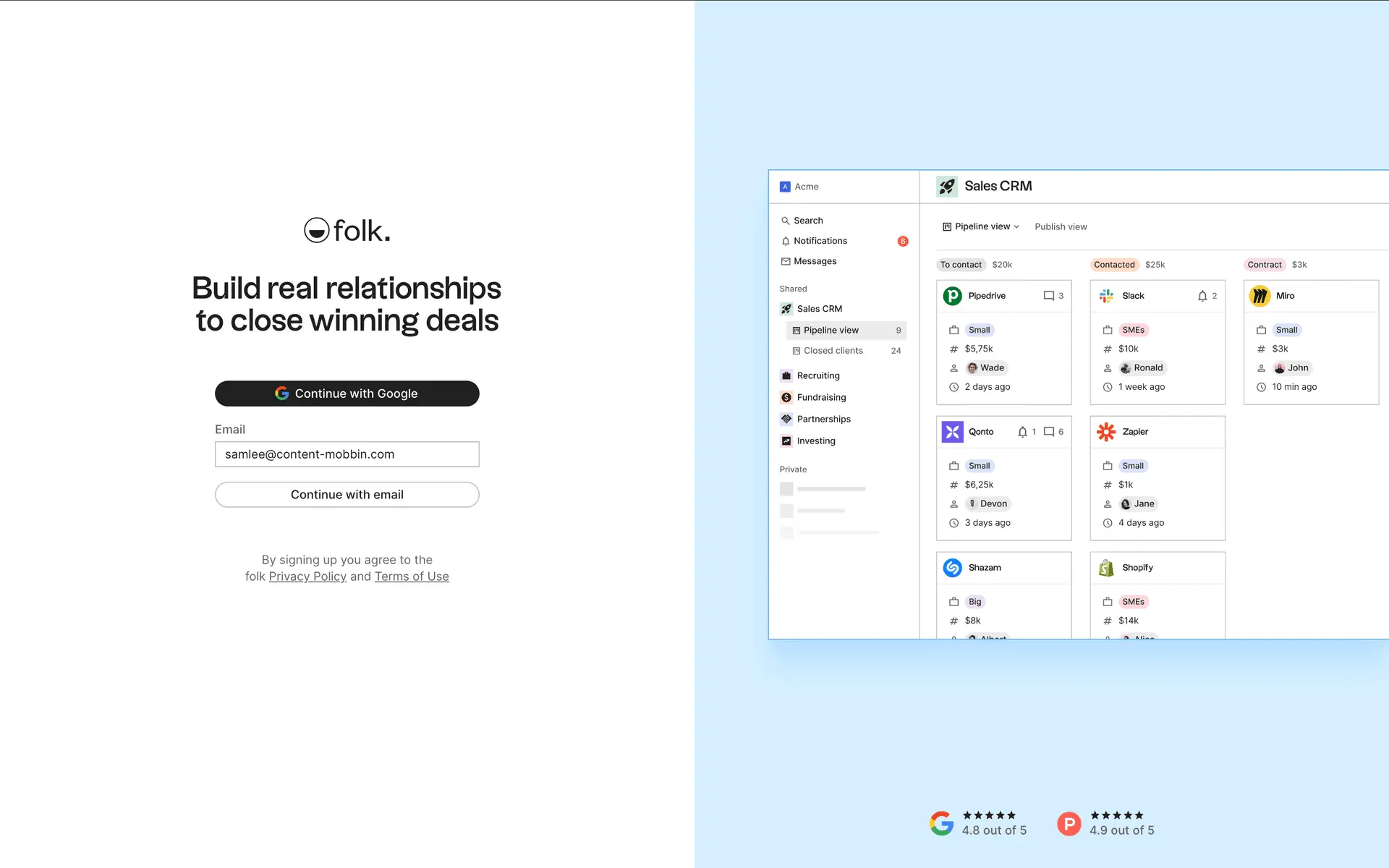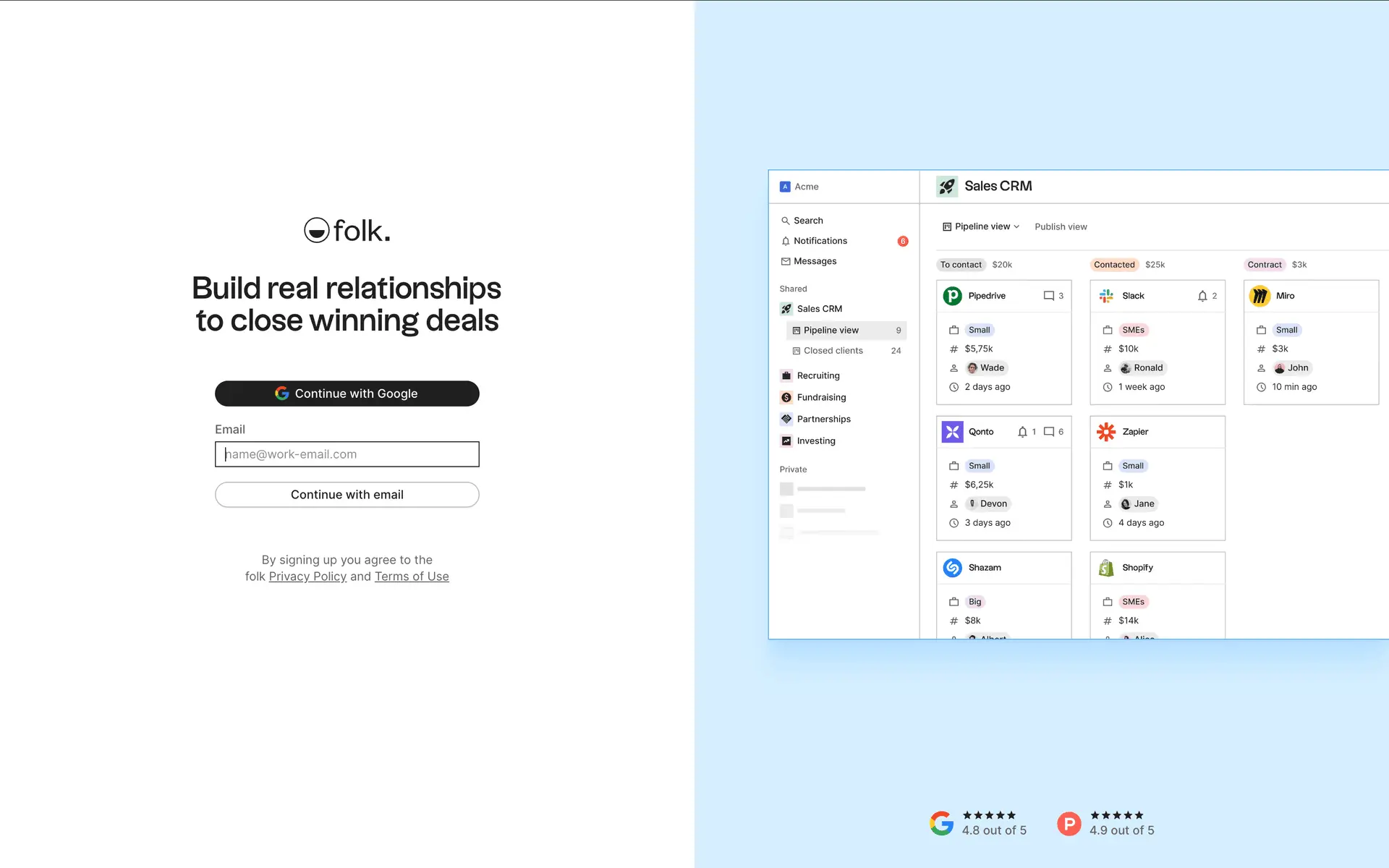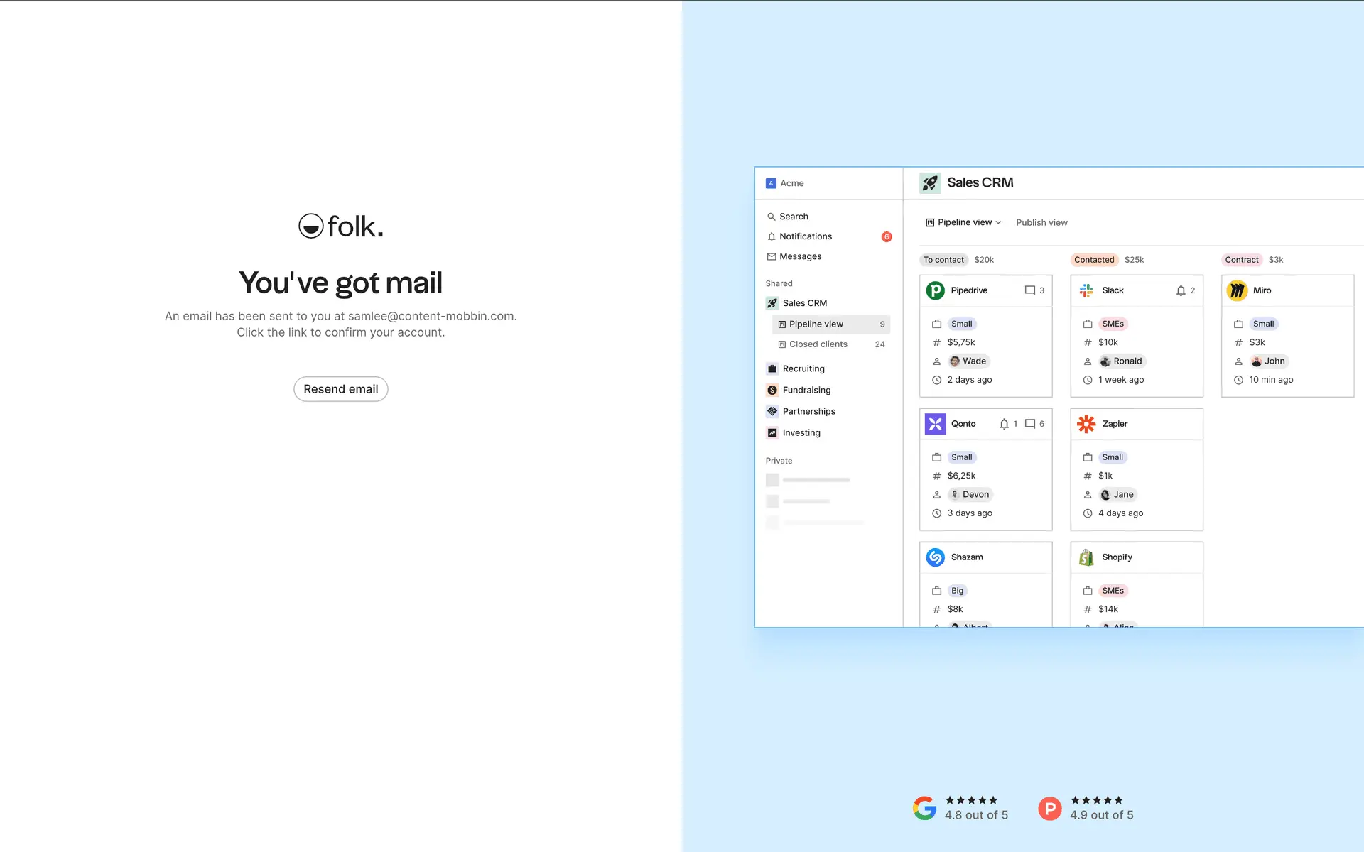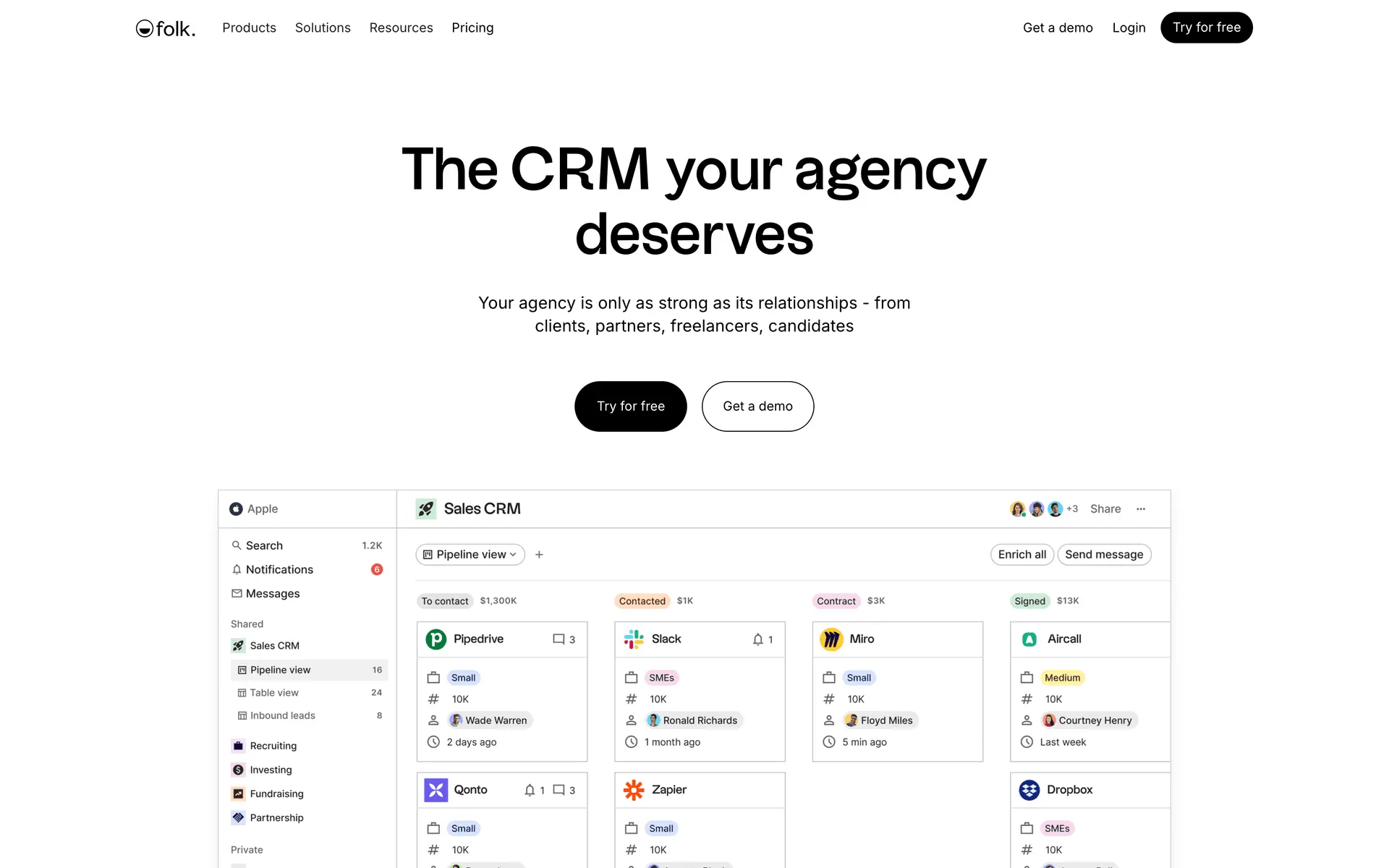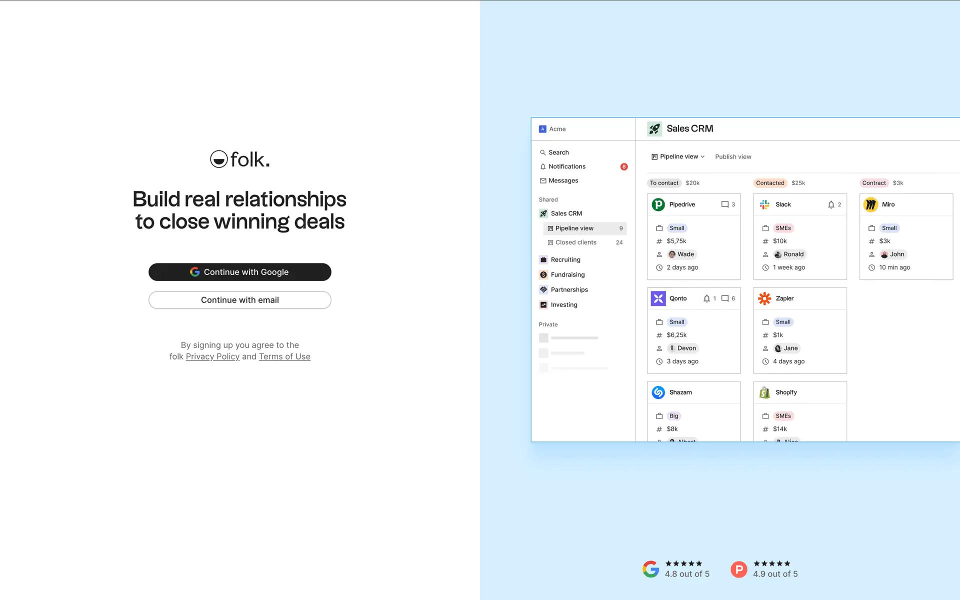 folk — современная CRM нового поколения, созданная для управления отношениями: продажами, партнёрствами, рекрутингом и нетворкингом. Сочетает простоту таблицы с мощью CRM.