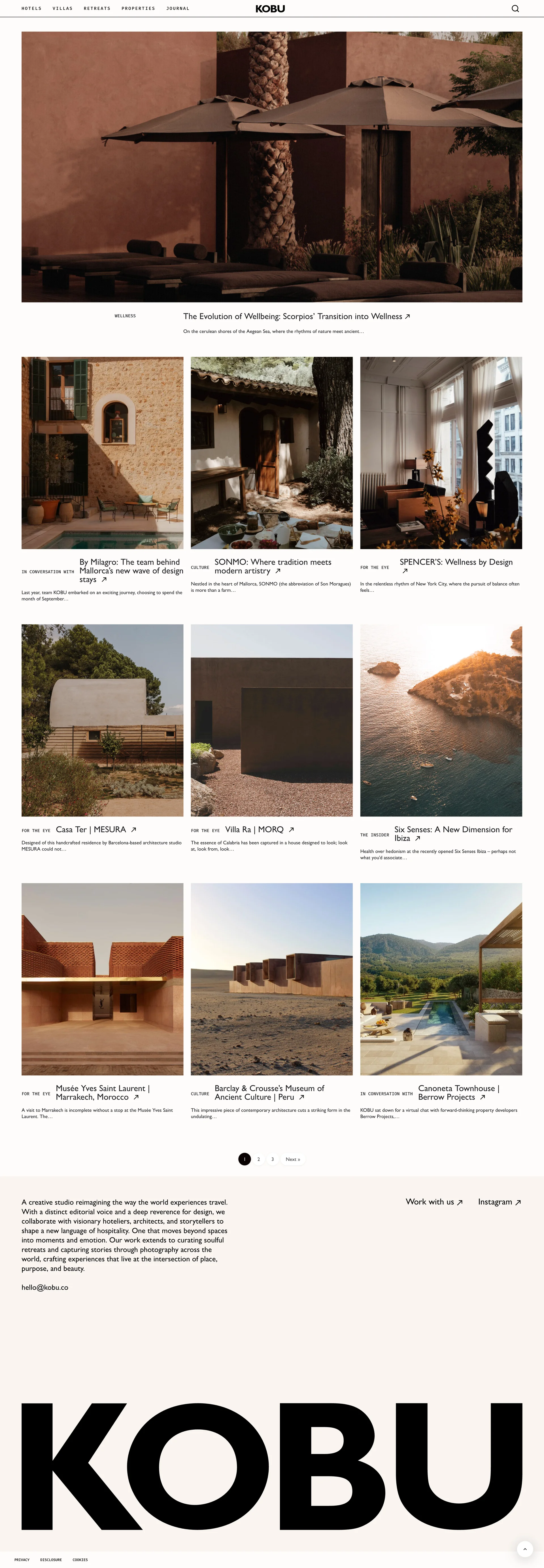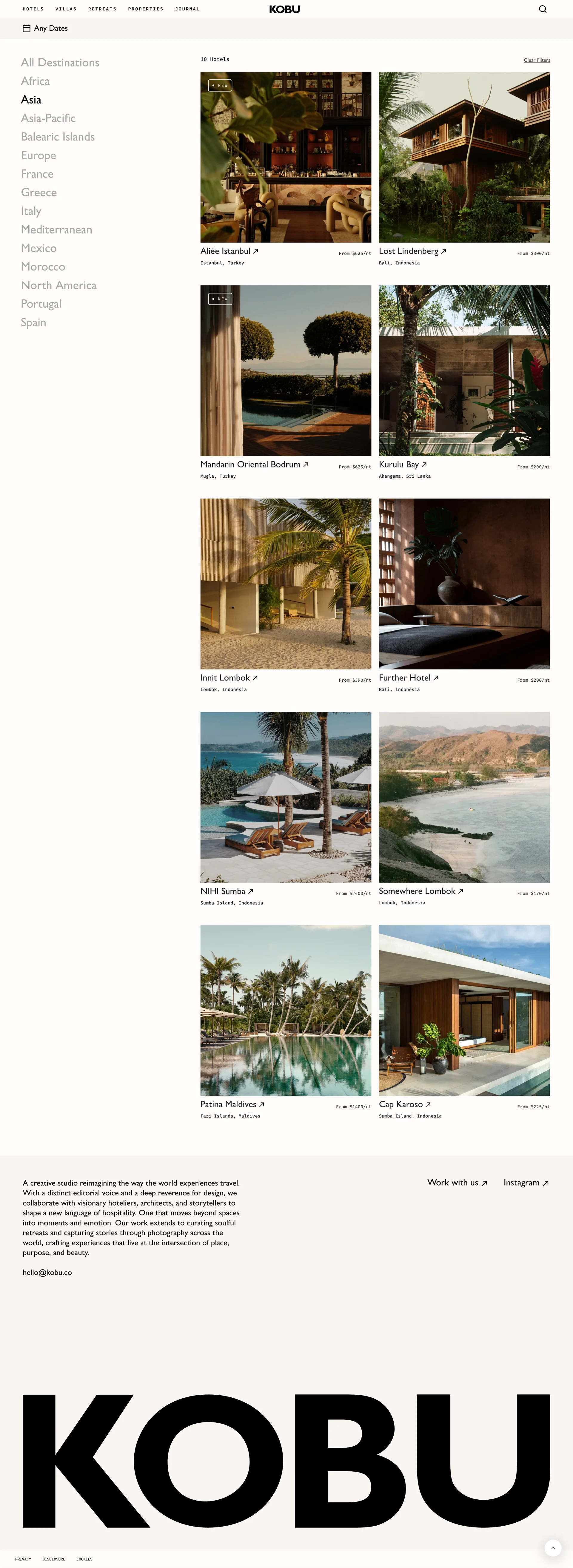 KOBU Curated stays, retreats, and photography worldwide kobu.com ↗ Travel Веб-сайт 5 скриншотов landingcard-gridsearchformnavbar F9F2F0 201A14 9E9A91