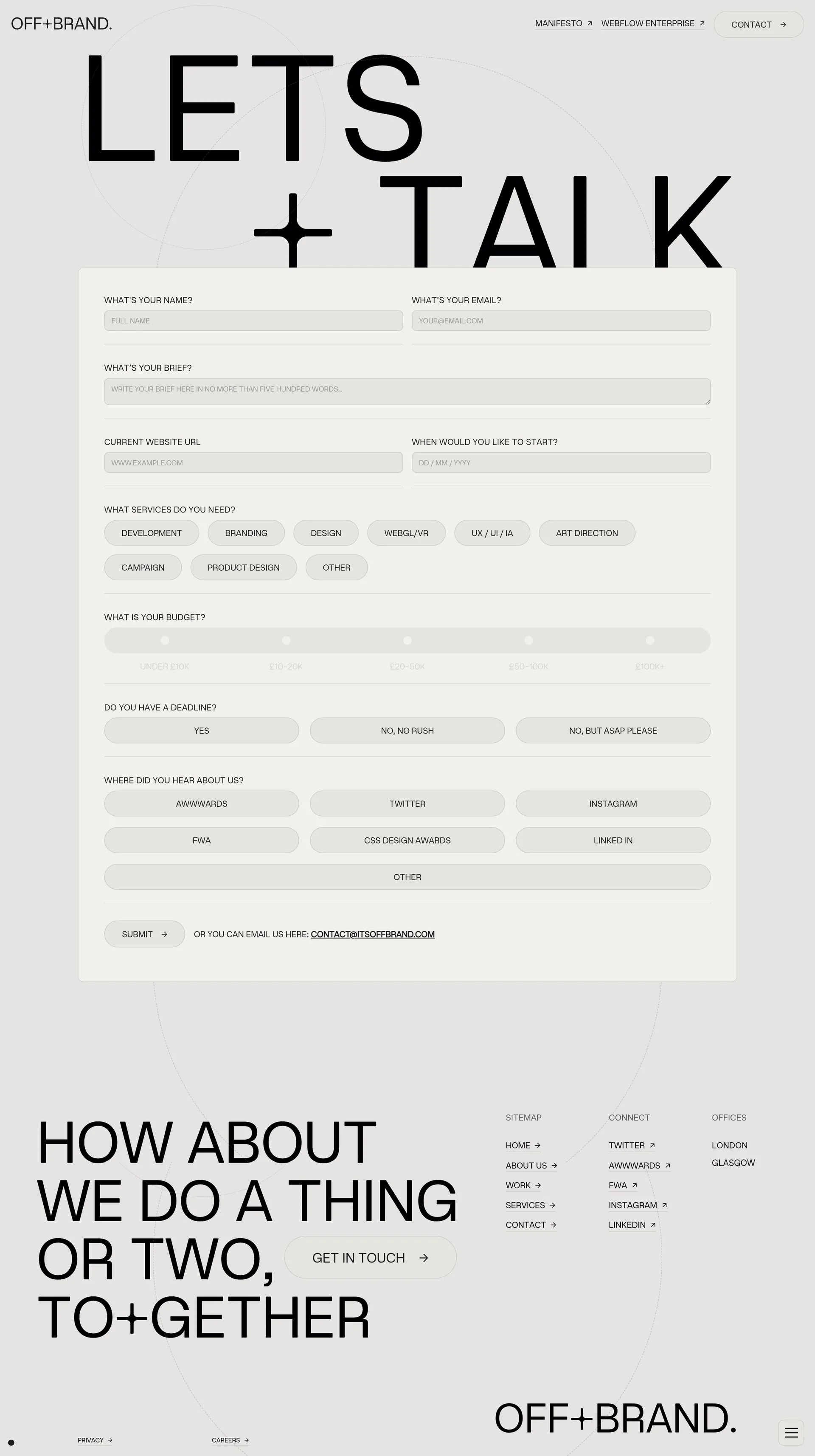 OFF+BRAND Design, development, branding, digital marketing & WebGL off-brand.co ↗ Design Веб-сайт 2 скриншотов portfoliolandingcard-gridnavbar 184367 DEE0E1 C94538