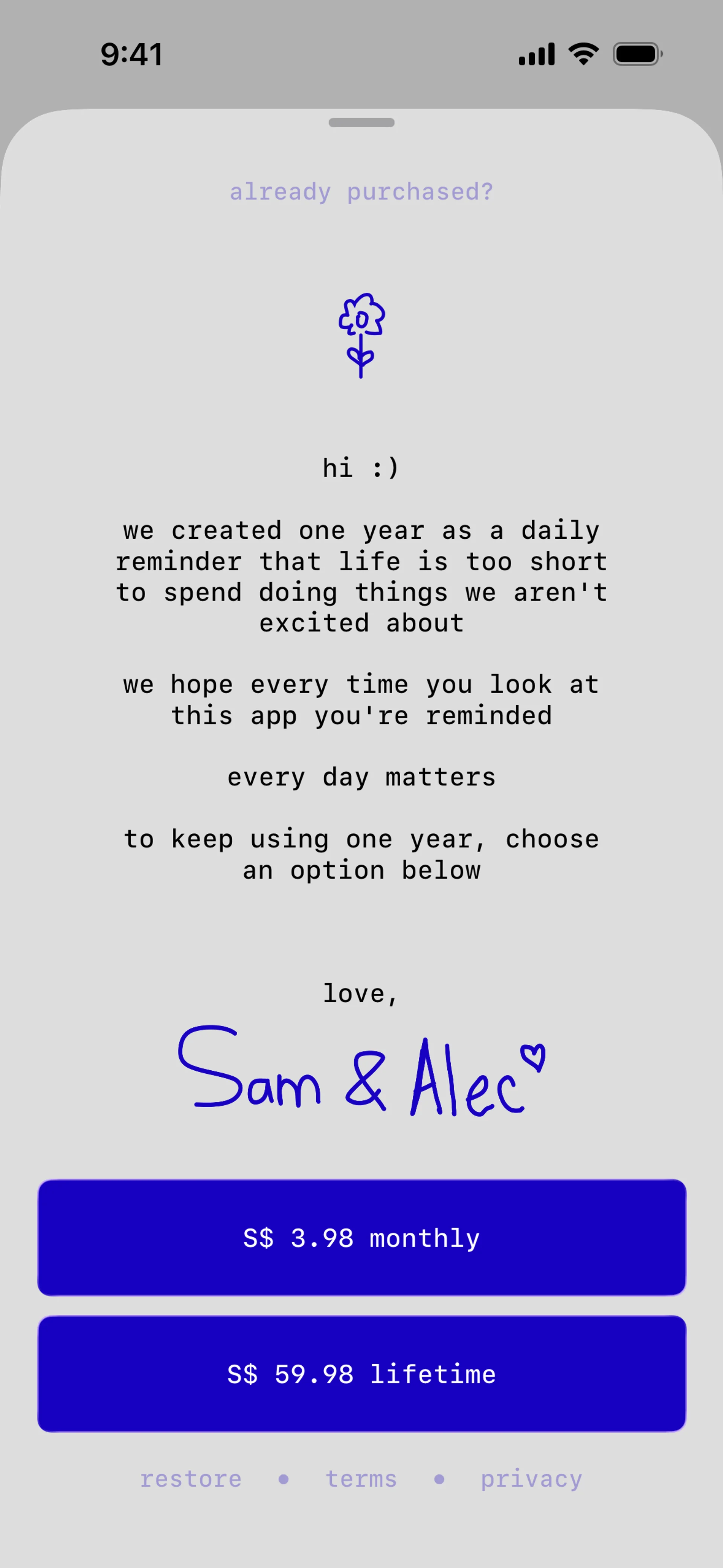 one-year-ios www.oneyear.app ↗ Productivity iOS-приложение 45 скриншотов calendarformprofilesettingsnotificationsonboarding E1DBE4 180C6C 747374