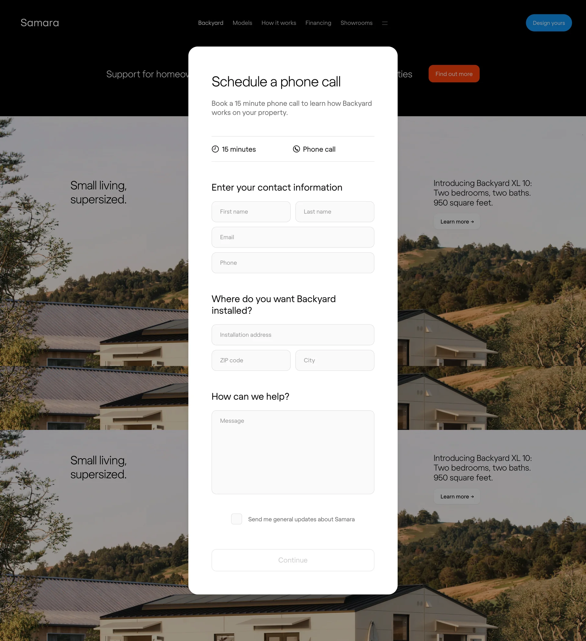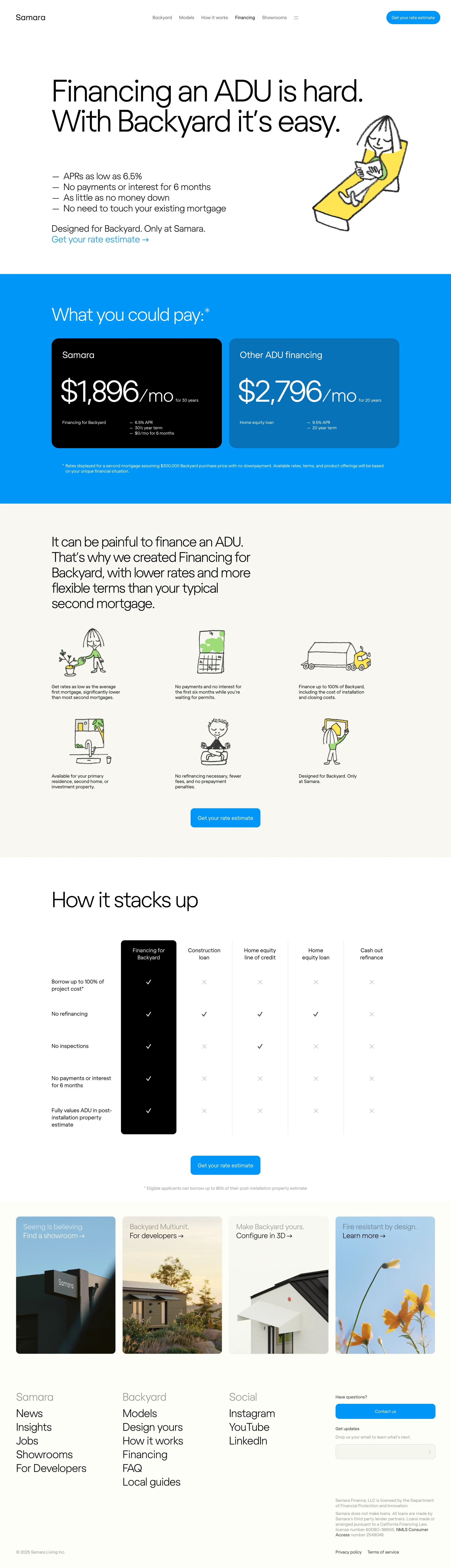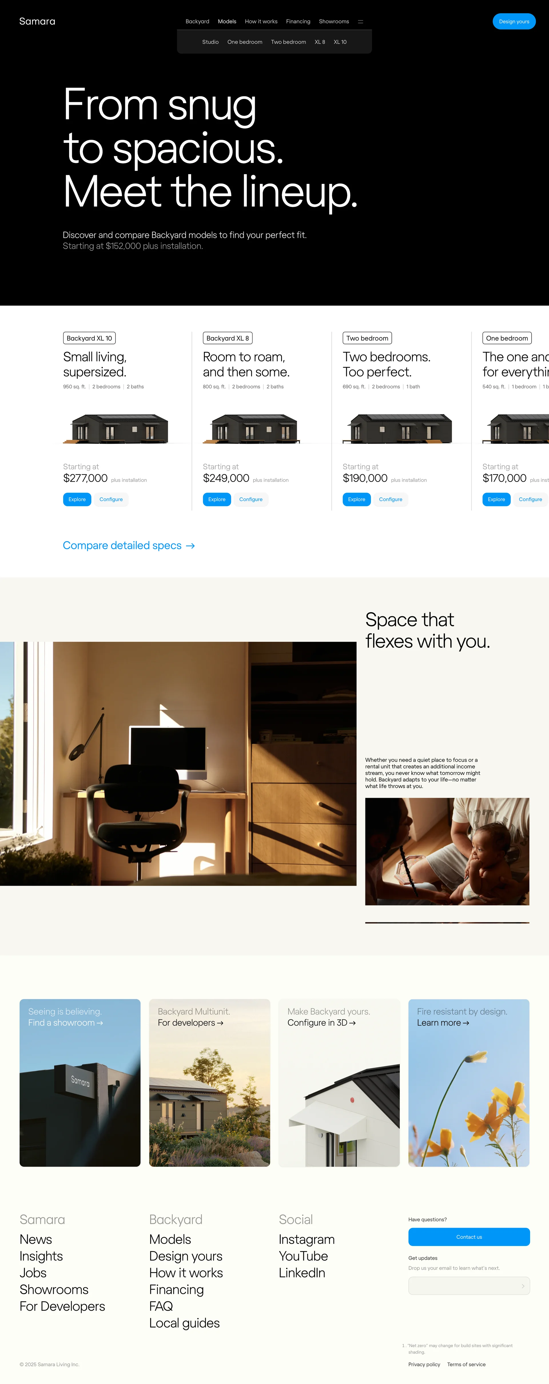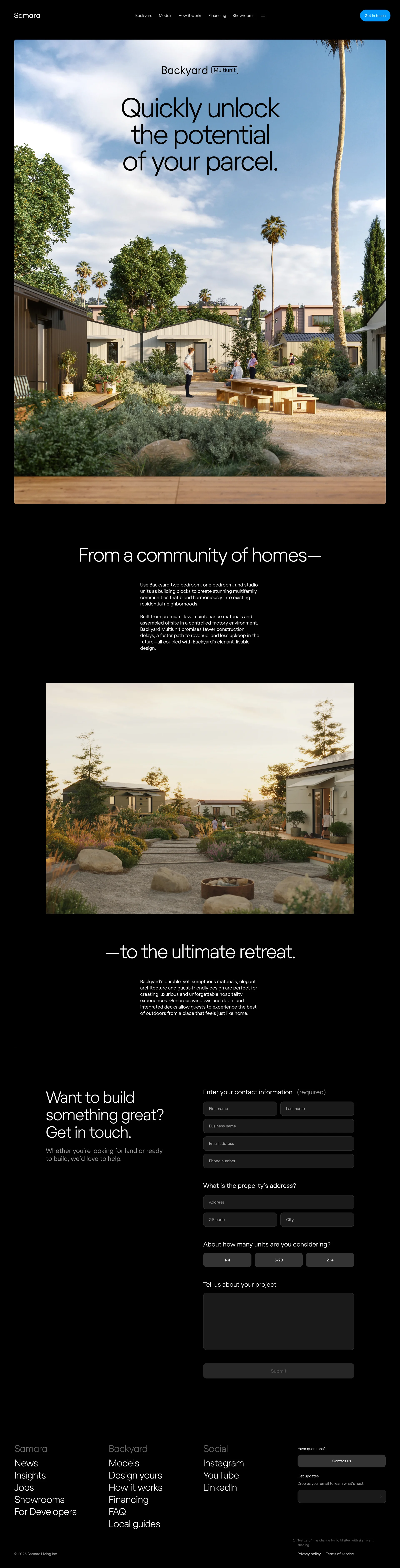 Samara Backyard homes and ADUs samara.com ↗ E-commerce Веб-сайт 10 скриншотов card-gridformlandingnavbar F4F5ED 394226 A99954