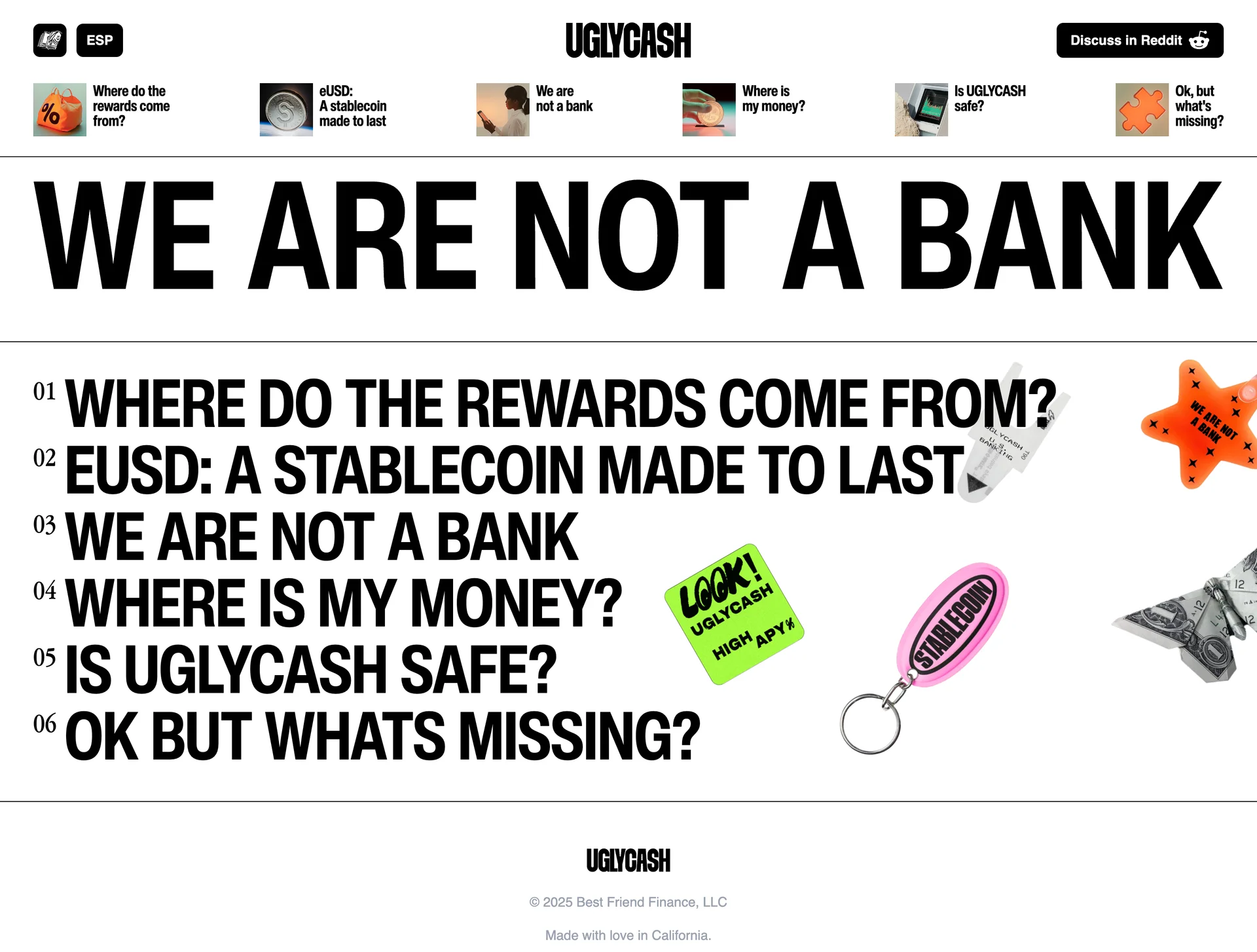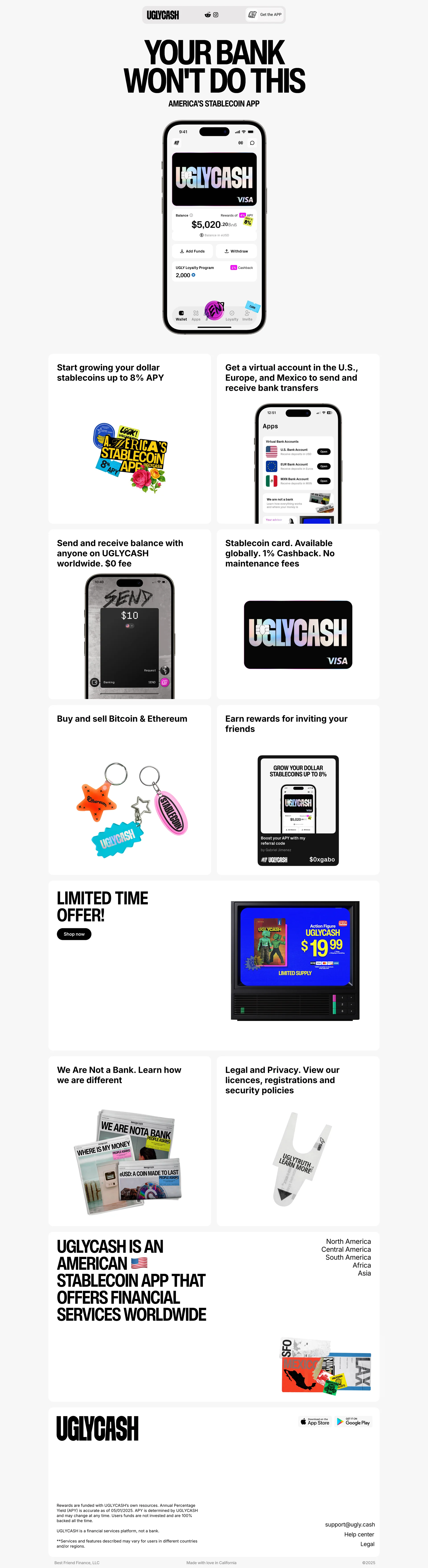 UGLYCASH America's stablecoin app www.uglycash.com ↗ Fintech Веб-сайт 5 скриншотов landingsignupdashboardformsettingssidebar F2F2F1 191B18 96583C